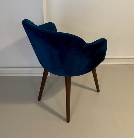 Sofacompany Vica spisestol / mødestol / konferencestol polstret i blå velour og med ben i valnød. Bemærk. Varen er brugt. Almindelige brugsspor kan...