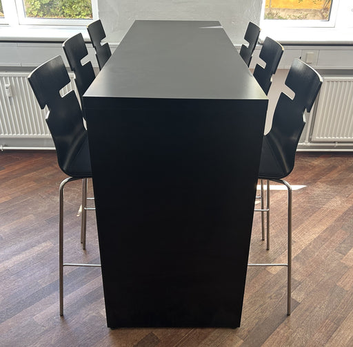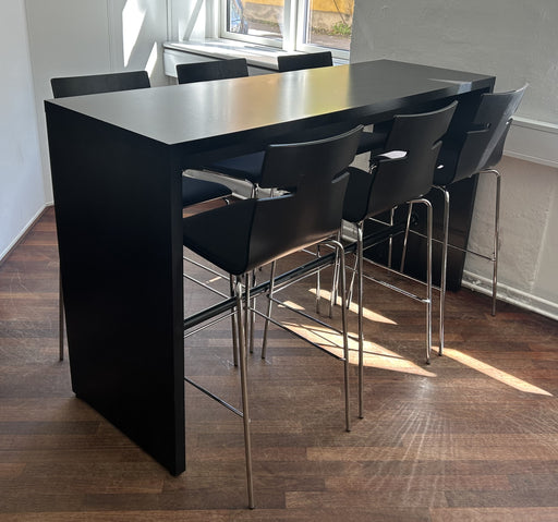 Fumac højbord i sort laminat. Bordet måler H/B/D = 109/180/60 cm. Bemærk! Varen er brugt. Almindelige brugsspor forekommer. Stole medfølger ikke.