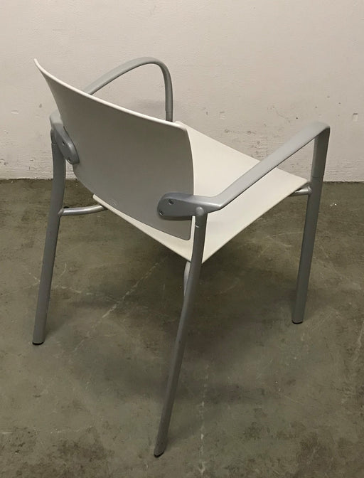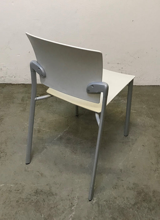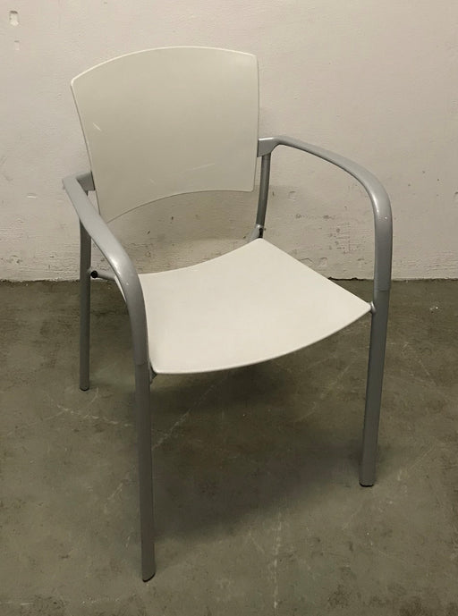 ENEA kantinestol i lys grå plast med integreret armlæn. Bemærk! Varen er brugt. Almindelige brugsspor forekommer.