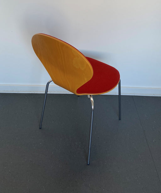 Kantinestol med krom ben og helstøbt sæde i rød lakeret træ. Bemærk! Varen er brugt. Almindelige brugsspor forekommer.