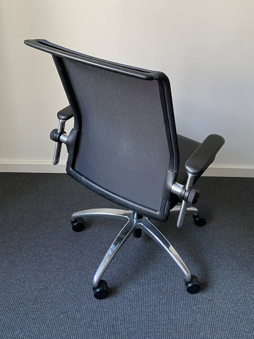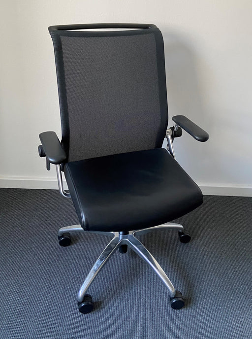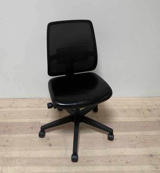 Haworth kontorstol med sæde i sort læder og net/mesh ryglæn. Stolen har justerbar lændestøtte. Bemærk! Varen er brugt. Almindelige brugsspor kan f...