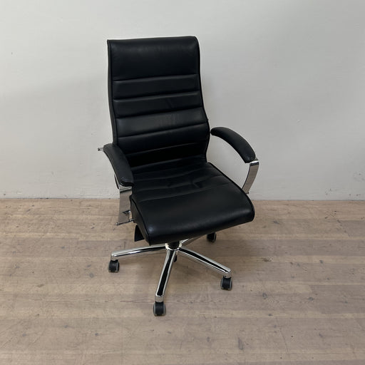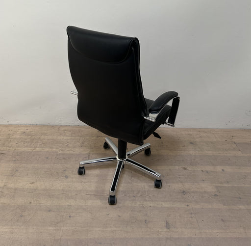Topstar kontorstol / chefstol i sort læder med armlæn. Bemærk! Varen er brugt. Almindelige brugsspor kan forekomme.