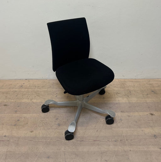 Sort Håg H04 4100 kontorstol med gråt stel. Stolen har mange indstillingsmuligheder som f.eks. Synkron vip og justeringsmuligheder for sædedybde ...