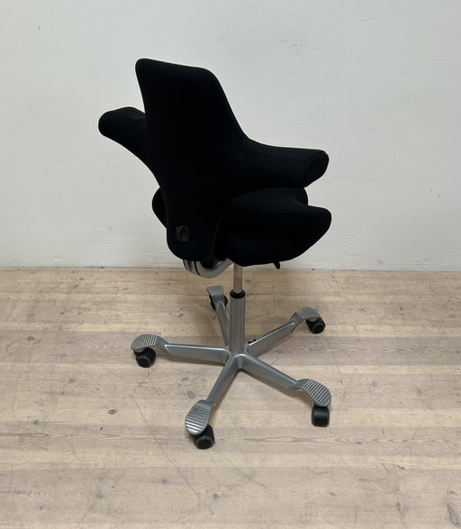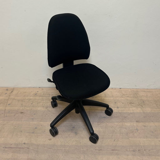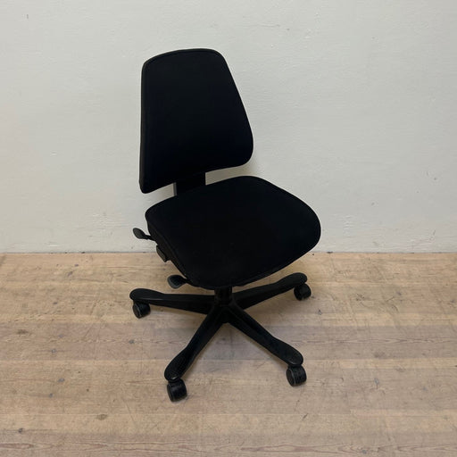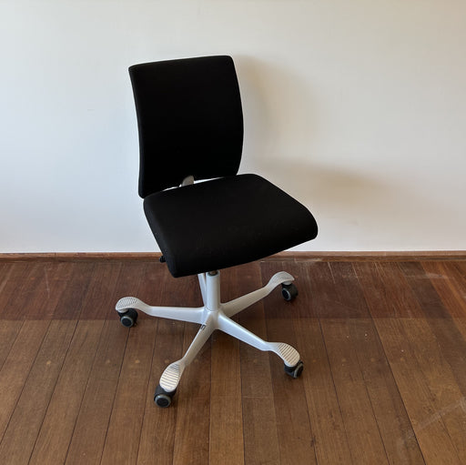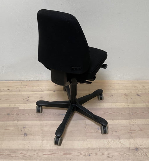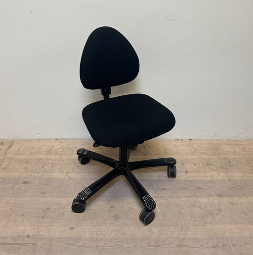 Sort Håg H04 4200 kontorstol med sort stel. Stolen har mange indstillingsmuligheder som f.eks. Synkron vip og justeringsmuligheder for sædedybde ...