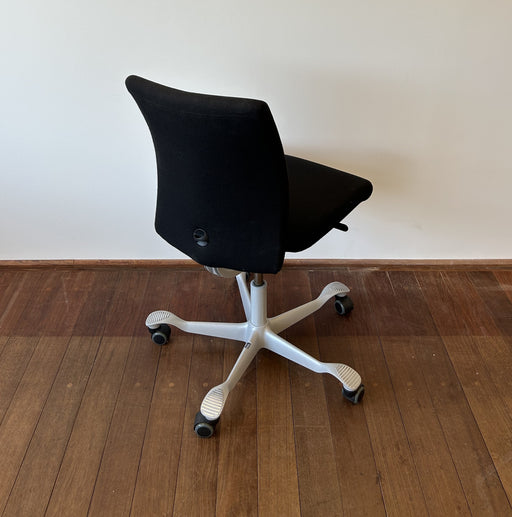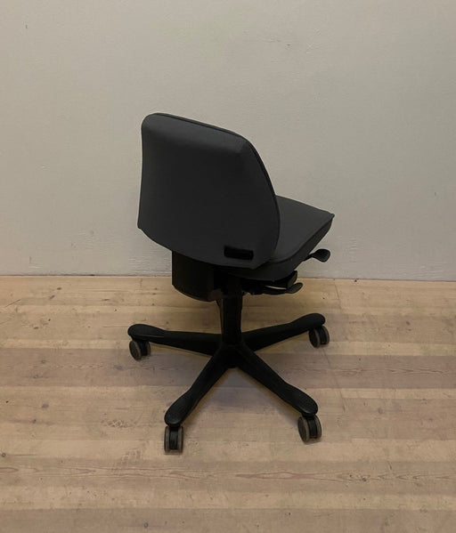 Sort Håg H04 4200 kontorstol med gråt stel. Stolen har mange indstillingsmuligheder som f.eks. Synkron vip og justeringsmuligheder for sædedybde ...