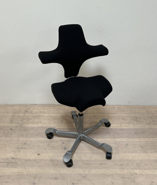 Håg Capisco 8106 Ergonomisk kontorstol / sadelstol.Stolen har gråt stel og er nypolstret med sort Advantage stof. Bemærk! Varen er brugt. Almindeli...