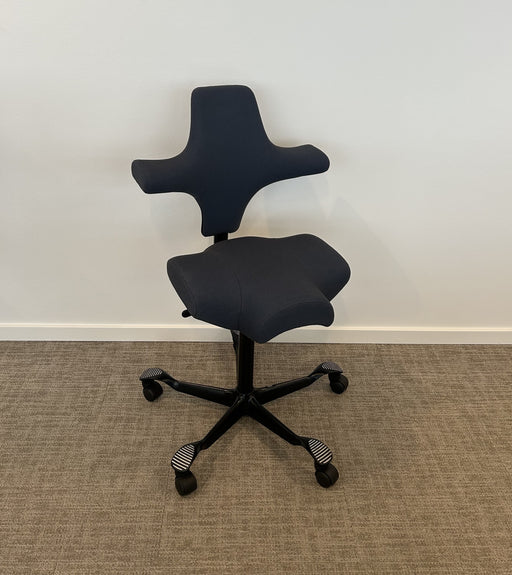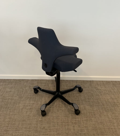 Håg Capisco 8106 Ergonomisk kontorstol / sadelstol produceret i 2017. Stolen har sort stel og er polstret i en flot grå/blå farve. Bemærk! Varen e...
