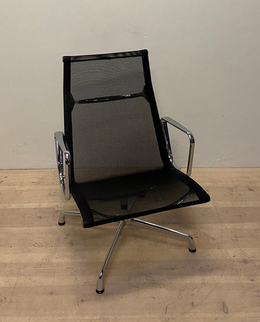Charles Eames EA 116 loungestol / lænestol produceret hos Vitra. Stolen er polstret i sort mesh / net og stellet er blankforkromet poleret aluminiu...