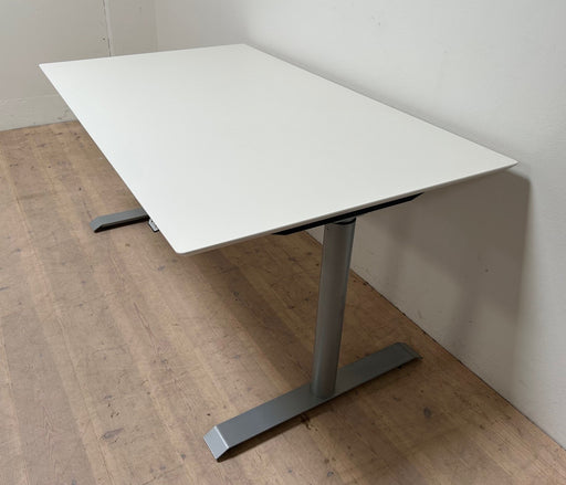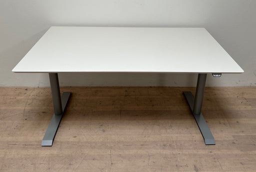 OMT el hæve/sænkebord med 150x90 cm. Hvid laminat bordplade monteret på gråt stel. Bemærk! Varen er brugt. Almindelige brugsspor forekommer. Borde...