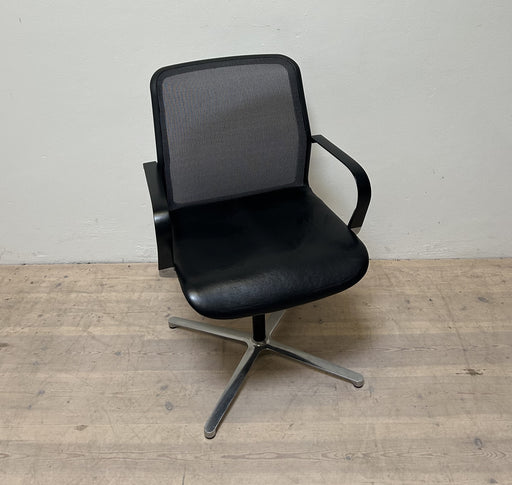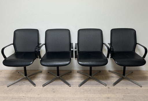 Bene Filo konferencestol / mødestol med armlæn og polstring i sort læder. Stolen har drejefunktion med returdrej. Sælges i sæt af 4 stk. Dvs. ligge...